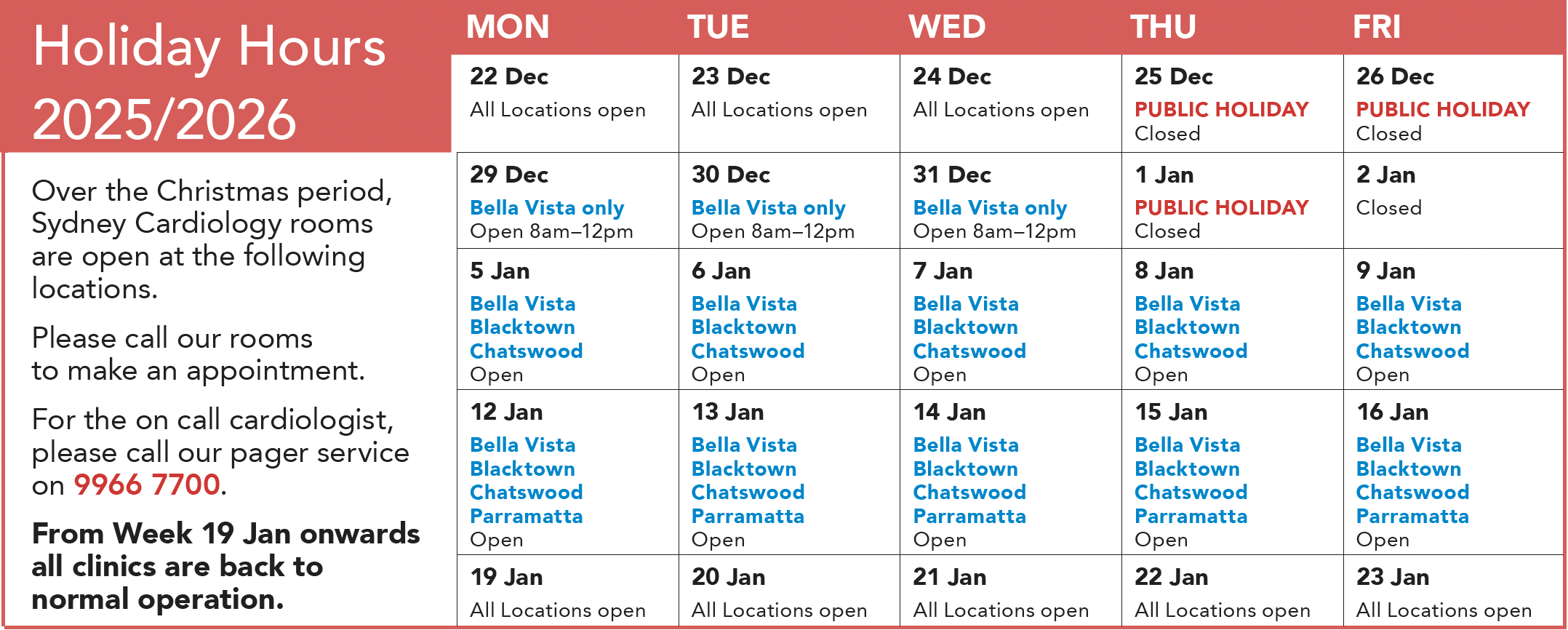 During the Christmas period, Sydney Cardiology rooms will be operating with adjusted opening hours. Click below to view the updated schedule on our calendar.